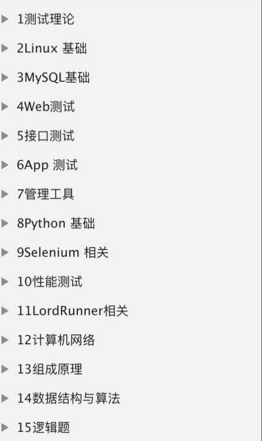 内容涉及:测试理论、Linux基础、MySQL基础、Web测试、接口测试、App测试、管理工具、Python基础、Selenium相关、性能测试、LordRunner相关等