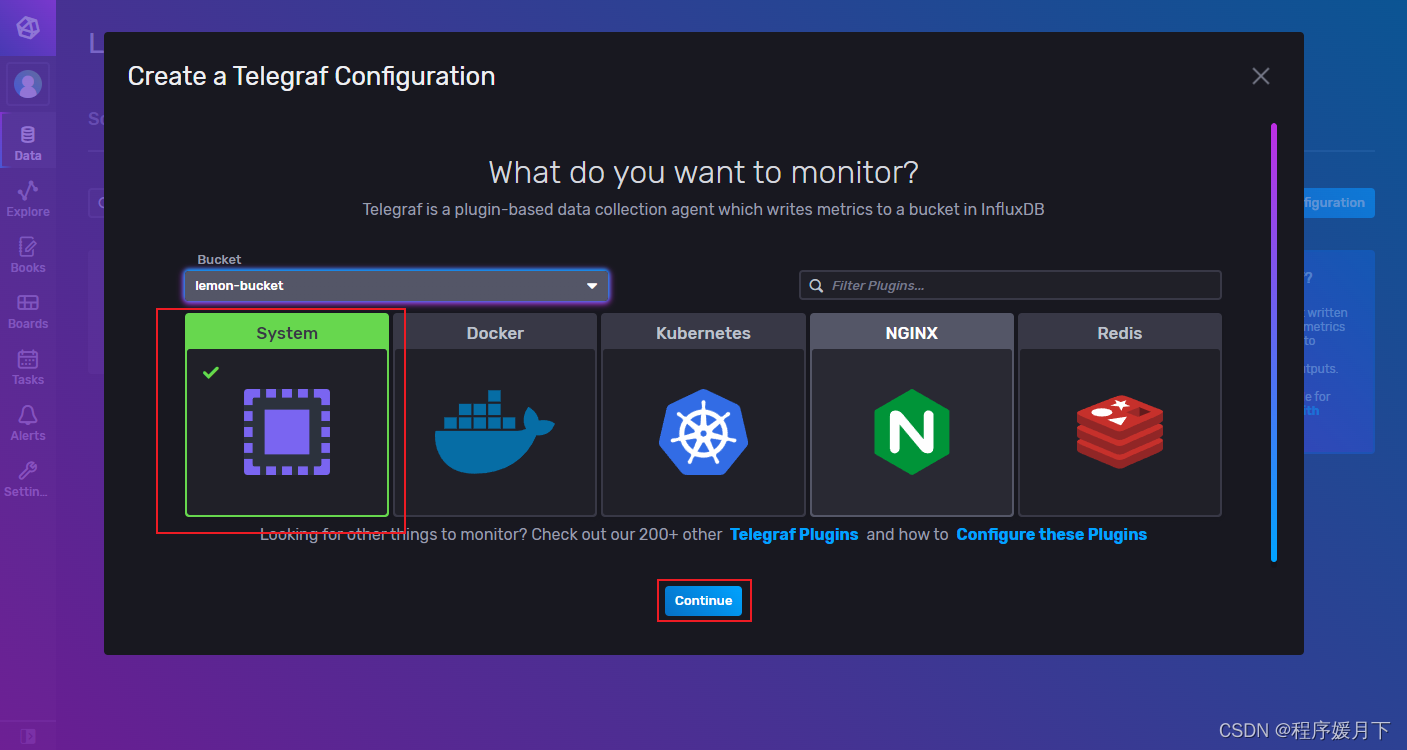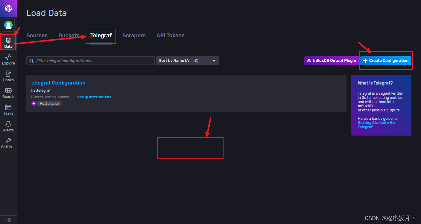 在influxdb2的UI平台中,进入Telegraf,点击create configuration