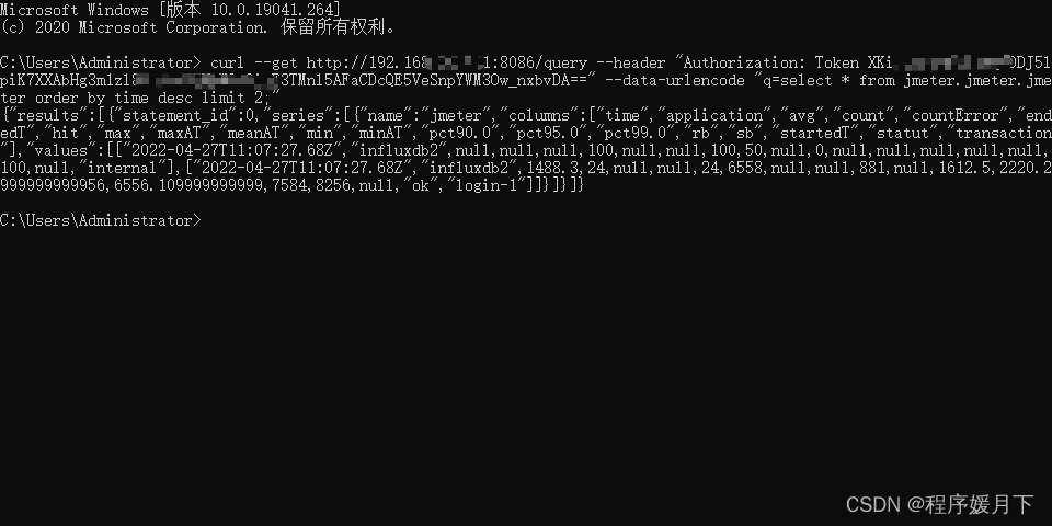 - 执行性能测试,此时,如果参数配置没有错误,数据就已经写入influxdb2数据库中,在任意可以连接到influxdb2数据库的机器终端窗口中执行 curl --get http://You_Influxdb2_ip:8086/query \ --header "Authorization: Token You_APIToken" \ --data-urlencode "q=select * from jmeter.jmeter.jmeter order by time desc limit 2;" # 这个sql意思是,查看jmeter库的jmeter表中,时间倒序的2条数据 # sql语句可以自己修改,与关系型数据库sql类似