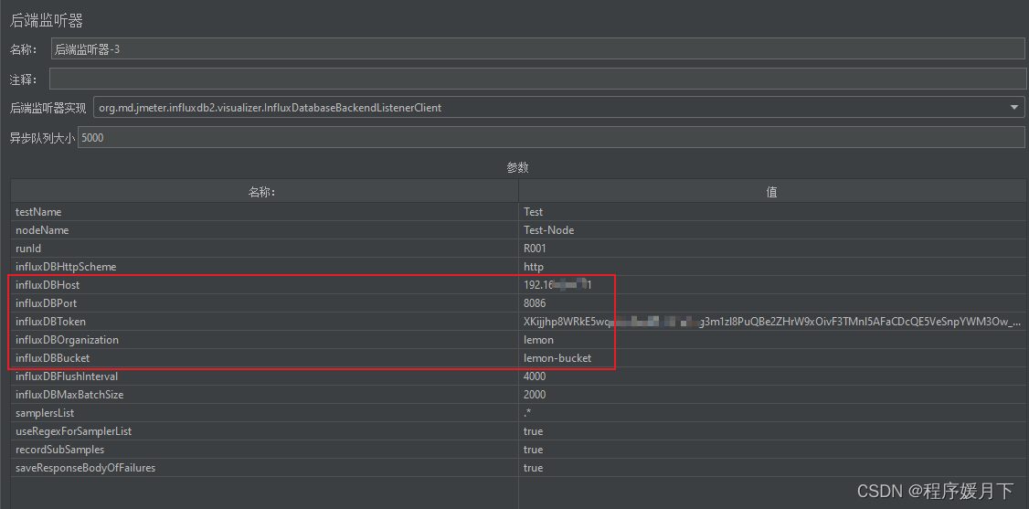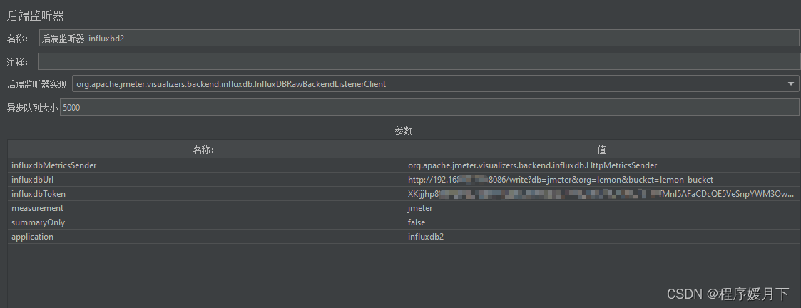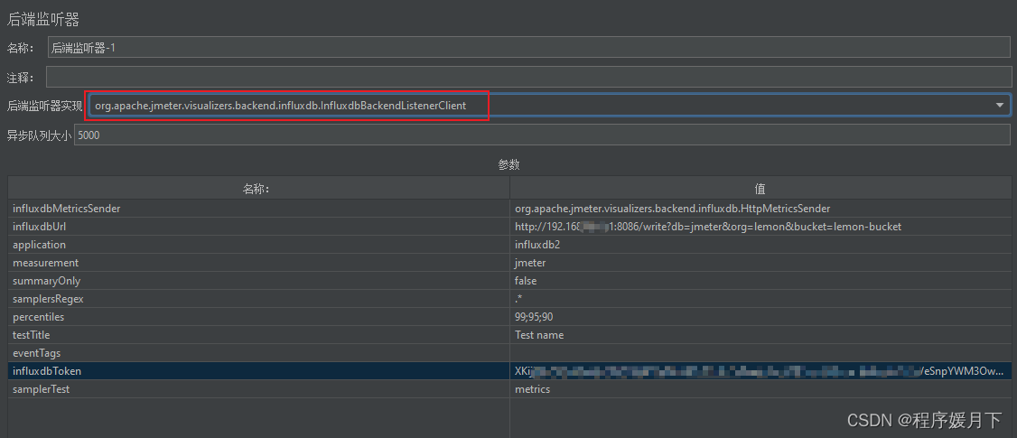 - 在jmeter的后端监听器中,选择 后端监听实现: org.md.jmeter.influxdb2.visualizer.InfluxDatabaseBackendListenerClient