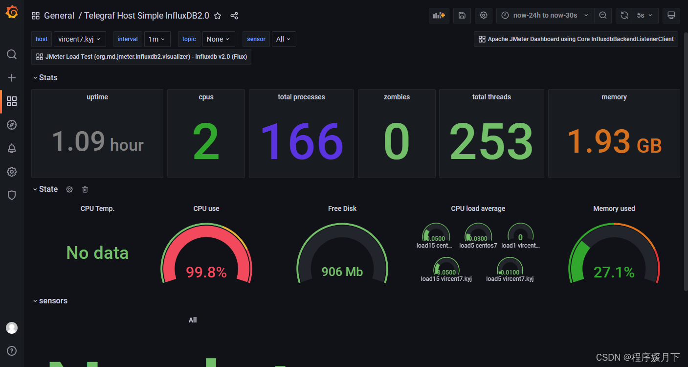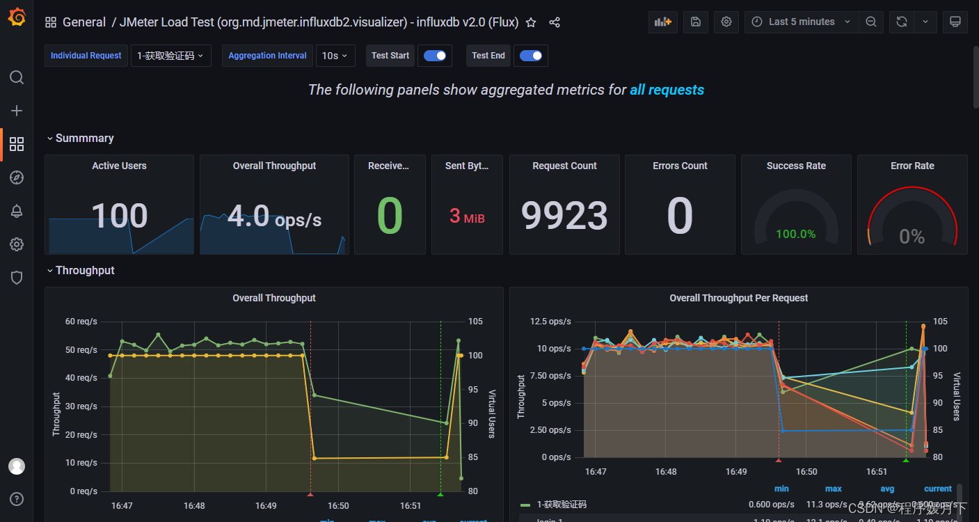 至此,我们用jmeter集成influxdb2和grafana搭建监控平台,监控性能测试过程数据完整实现。