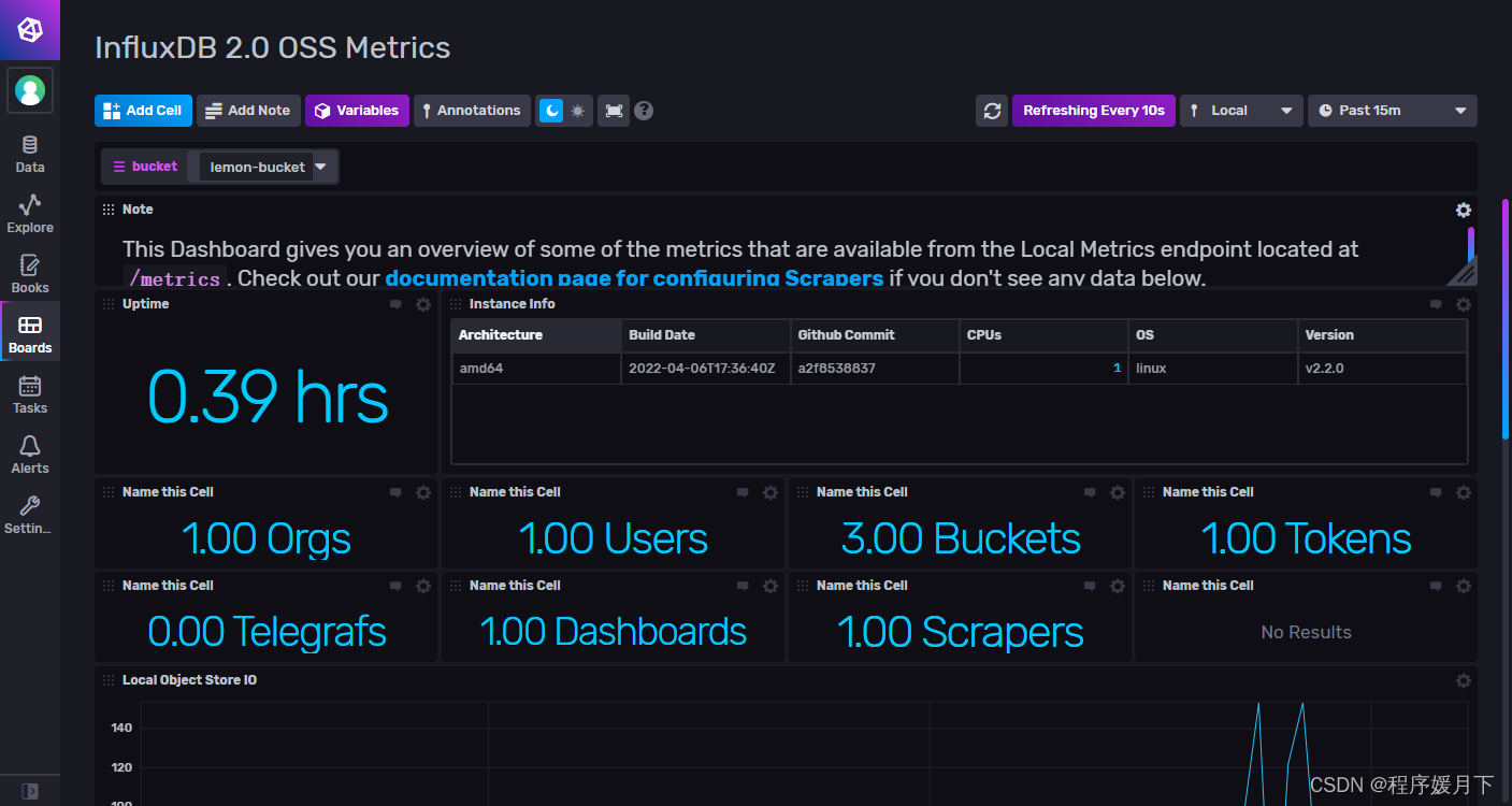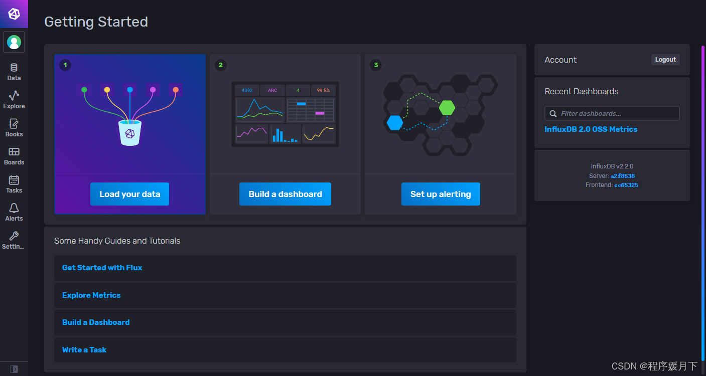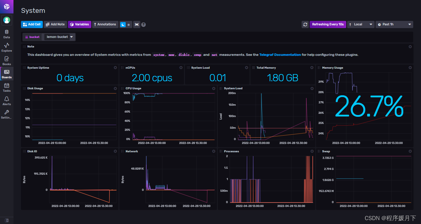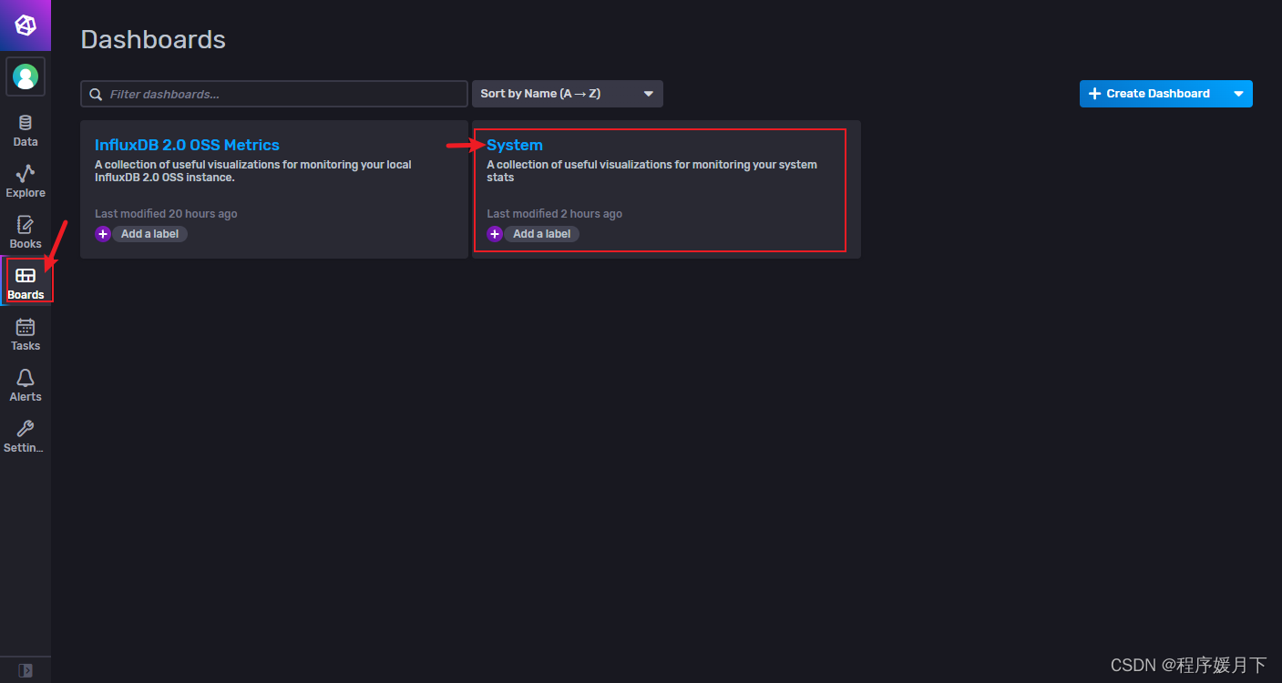 此时,已经在开始收集被监控的机器硬件资源使用情况了,在influxdb2的UI界面,点击Boards,选择system