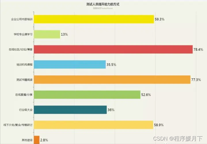 从调查的数据来看,大部分测试工程师提升的方式还是集中在论坛社区、阅读书籍以及沙龙内训上。