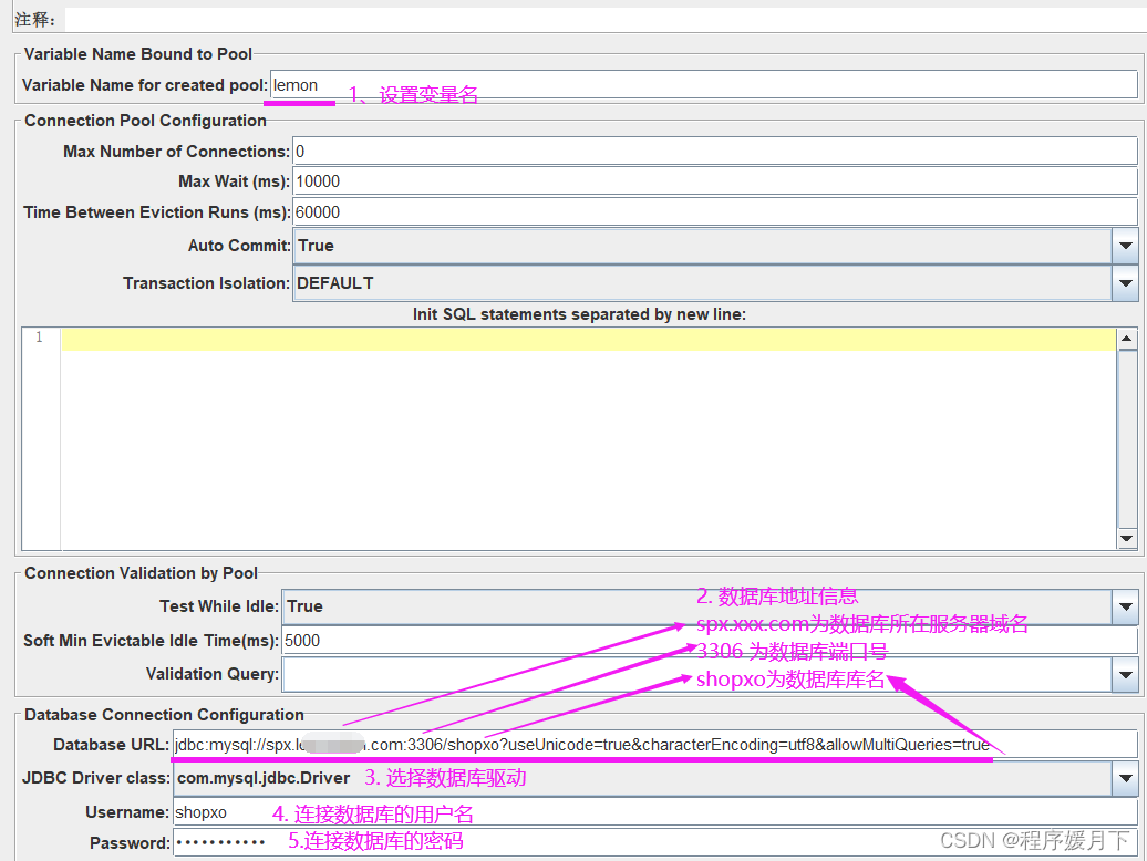 第一步:通过JDBC Connection Configuration,建立数据库连接