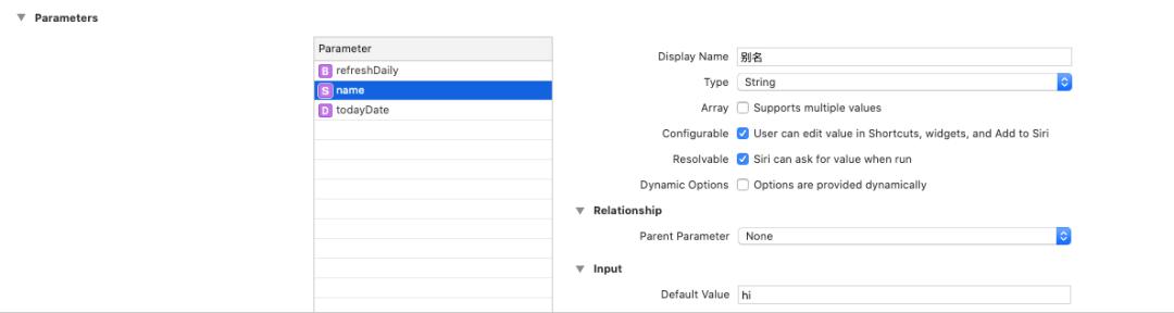 开发者不需要编写配置界面,只需要设置所需的配置信息即可,比如可以通过配置xxx.intentdefinition,指定显示名称、类型、默认值等等。