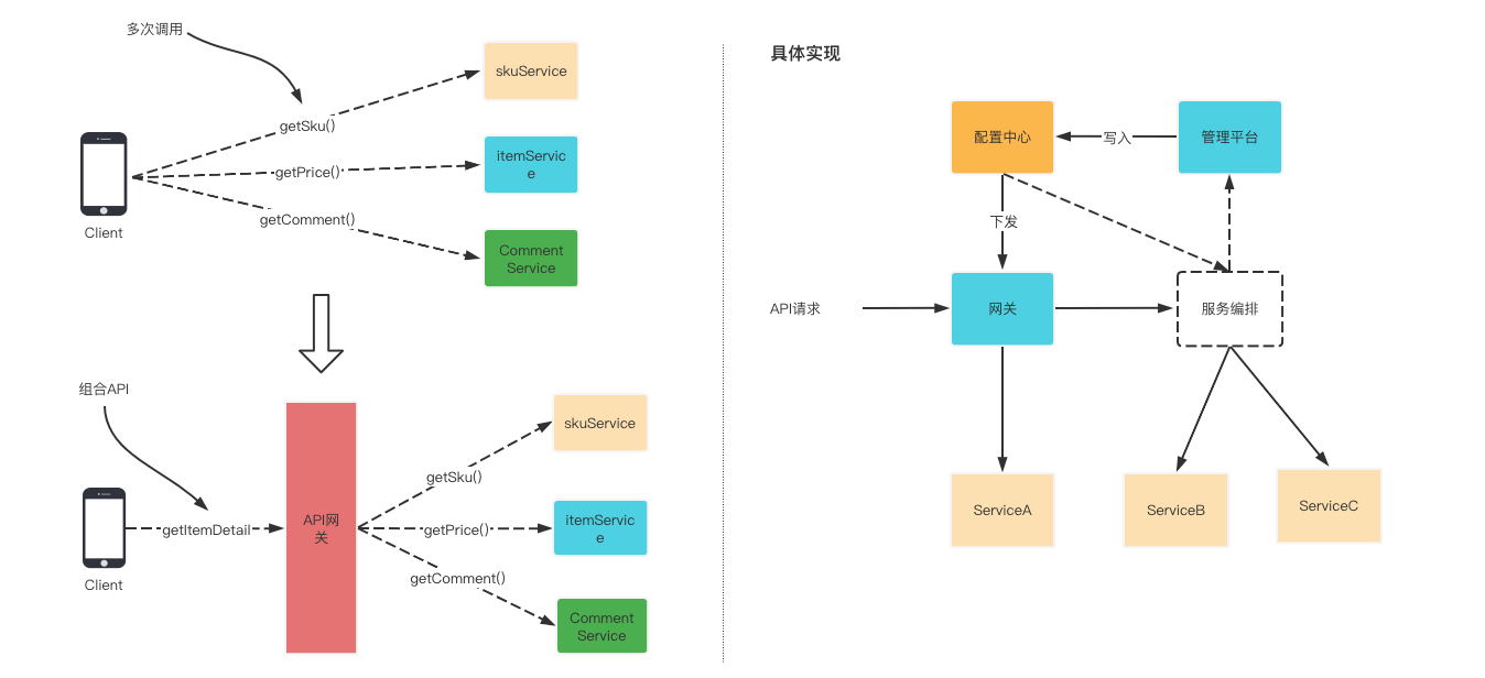 服务编排也是API网关需要满足的一个常见需求,主要是将多个API做聚合调用,大幅降低调用延迟。这部分功能之前是在网关上的,在网关层面支持的服务编排相对来说较为基础,能够支撑API的并发聚合调用,但难以处理复杂的业务组合,特别是涉及到事务的编排场景。因此,我们决定将这部分功能,抽取出去做独立服务,而后续的链路网关会直接访问服务编排模块,这样也保证了网关整体相对轻量。
