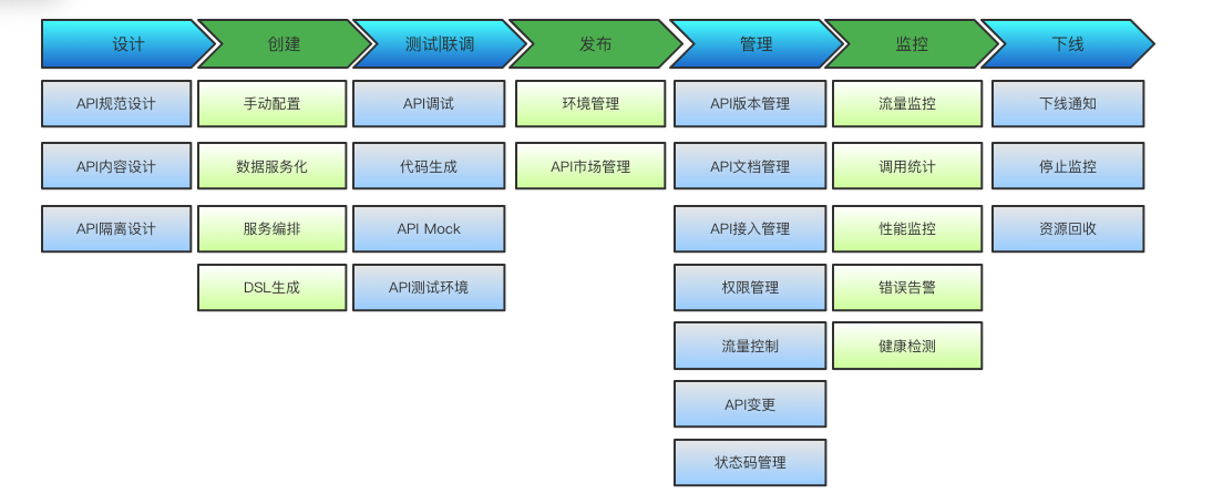 比如,在API设计上,要统一规范,规定API必须有归属服务和标签,做到API设计上的隔离;设计完成后要能够直接调试,自动生成测试代码;发布时,对API流量要做到精细化控制,支持服务的灰度发布;在API运行过程中,要能够对API调用情况进行全方位的监控和告警,对出现问题的服务能够及时地熔断隔离;下线后能够及时回收资源。