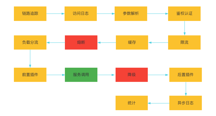 在整个请求链路中,我们设计实现了链路追踪、日志、鉴权、限流、熔断、插件等一系列核心功能。