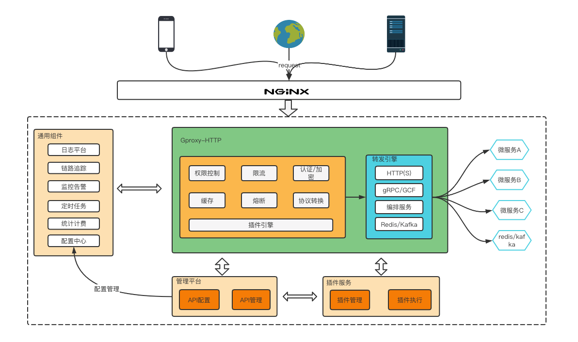 首先是一个Web管理平台,API的创建、发布和后续管理都可在管理平台上配置完成;配置完成后,会下发到配置中心通知到网关,同时网关也会定时拉取全量的API配置;然后是网关的一些核心组件,比如插件引擎,主要是执行配置的一些插件。转发引擎也是API网关的核心模块,个推的转发引擎支持http、grpc,同时还有个推自研的gcf协议,而在数据中台的业务场景下,也支持了kafka的数据推送能力。