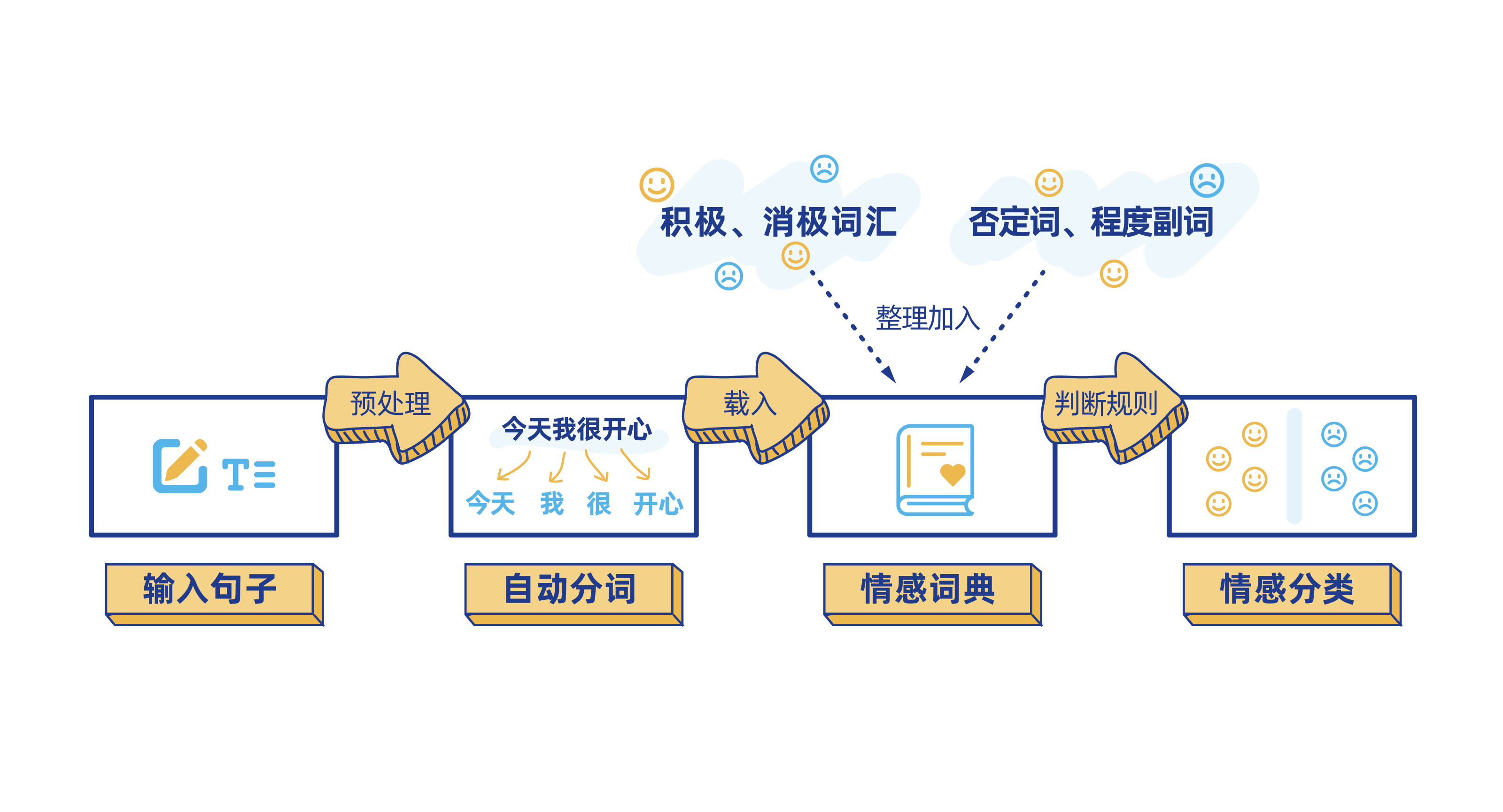 我们知道,句子由词汇组成,包括停顿词(的、和、地、得、之间……),正面评价词(价格便宜、干净、美丽、物美价廉......),负面评价词(埋汰、脏、差、坏……),程度词(还行、非常好、凑合、一般、特别......),疑问词(难道、岂、居然、竟然、究竟、简直、难道、反倒、何尝、何必......)以及否定词(不、莫、无、弗、非、否......)等等。要理解一句话的情感和态度,就需要对句子中各个词汇的词性进行分析。所以我们需要对上阶段转译好的文本进行分词处理,然后综合每个词的情感倾向最终得出该语句整体的情感态度。
