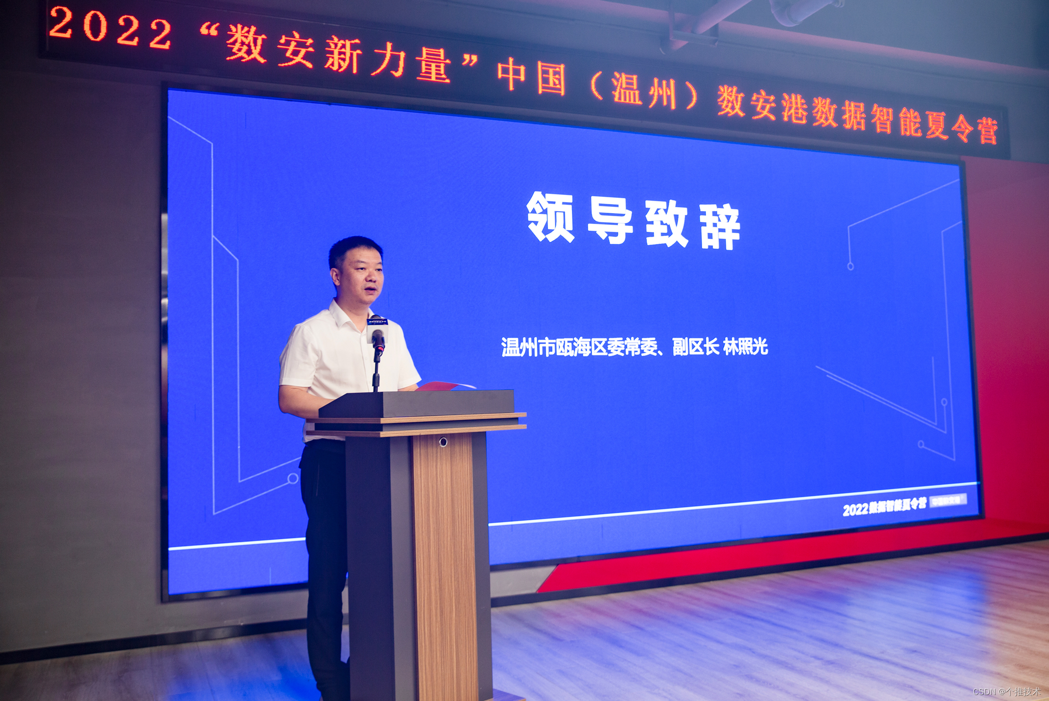 温州市瓯海区委常委、副区长林照光为活动致辞,他表示“此次夏令营的举办,是数安港‘育人才’的起点。希望大家勇于实践,推动数据安全与创新发展。充分发挥自身的学术技术优势,为数字中国、幸福温州的建设注入源源不断的力量。”