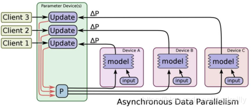 分布式开发会涉及到更新梯度的方式,有同步和异步的两个方案,同步更新的方式在模型的表现上能更快地进行收敛,而异步更新时,迭代的速度则会更加快。两种更新方式的图示如下: