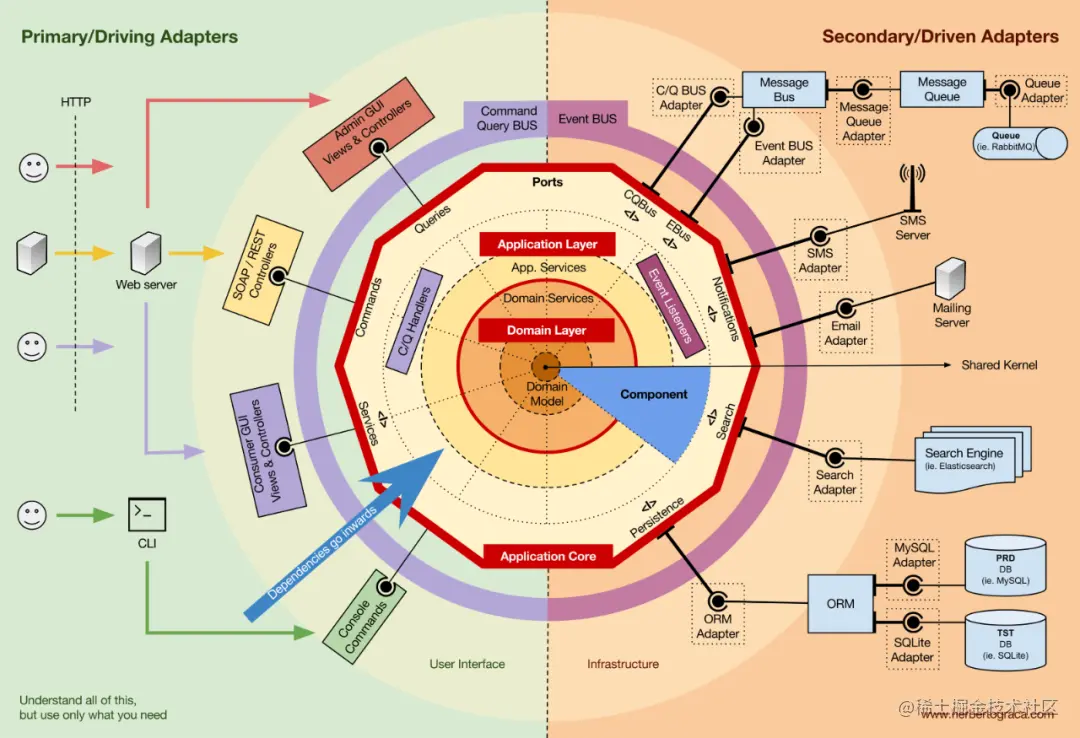 六边形架构,因为长得像蜂窝,看起来就很靠近绿色的自然界,很高大上。说实话,我到现在都没弄明白六边形架构,八边形架构(没这种东西),三角形架构(没这种东西)之间,到底有何区别,这群名词狂魔为啥选择了6这个数字。