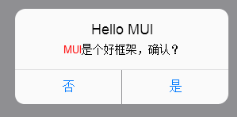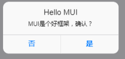 document.getElementById("confirmBtn").addEventListener('tap', function() { var btnArray = ['否', '是']; mui.confirm( '<span class="muiSpan">MUI</span>是个好框架,确认?', 'Hello MUI', btnArray, function(e) { if (e.index == 1) { info.innerText = '你刚确认MUI是个好框架'; } else { info.innerText = 'MUI没有得到你的认可,继续加油' } }) });