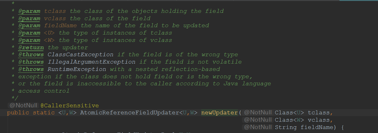 当不知道对应类型的原子类怎么构建时,源码是一个很好的选择,如上案例,进入源码,找到newUpdater,方法的注释会很明确的告诉你每个参数代表的意思,如图: