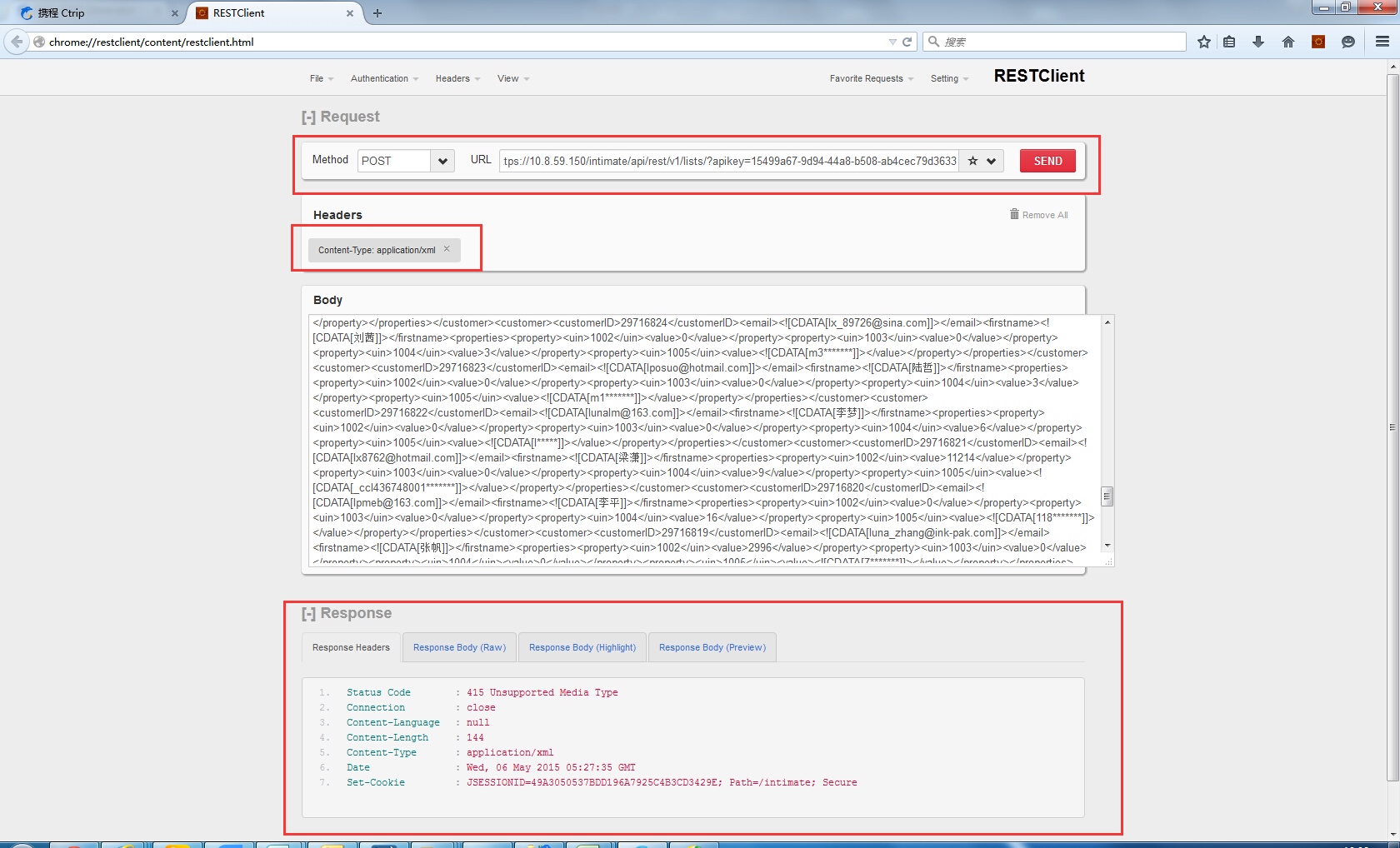 2、重启后可以在Mozilla Firefox地址栏右侧看到RESTClient图标,点击图标进入使用。可以配置Request:POST、GET请求URL、Content-Type、Body。点击send执行完毕返回并显示Response:Response Headers 、Response Body (Raw)、Response Body (Highlight)、Response Body (Preview);