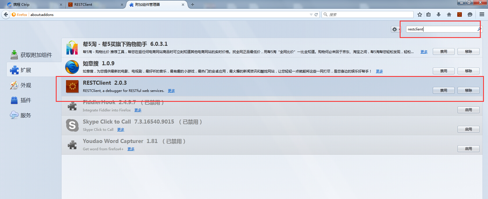 1、打开火狐扩展搜索RESTClient进行安装并重启浏览器。
