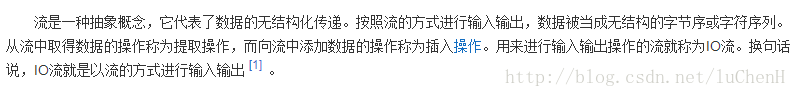 对于java程序来说,也是一样的,从源地到我java中的流,便是输入流(InputStream),而从我java中流出的便是输出流(OutputStream)