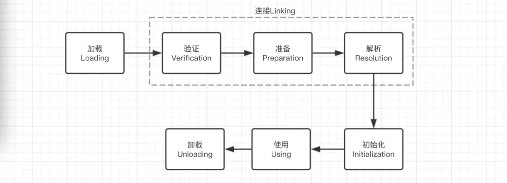 其中,加载、验证、准备、初始化和卸载这5个顺序是固定的,即类的加载过程按这个顺序开始(但并不是按照这个顺序进行或完成,而是各个阶段交叉进行)。