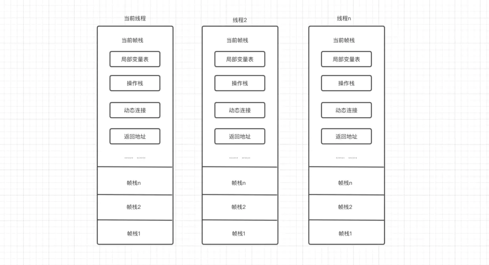 概念模型上,典型的帧栈结构如下(栈是线程私有的,也就是每个线程都会有自己的栈)。