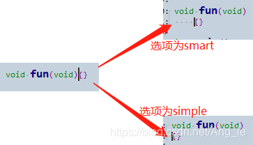 具体的选项smart和simple的差异在编辑代码时体现,在一个函数后输入大括号,按下回车后的大括号所在位置体现出差异,根据个人的编码习惯而定。具体如下图所示。