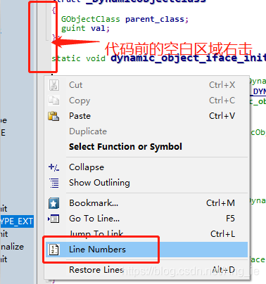 在下图中可以看到代码没有行号,在代码前的空白区域右击鼠标出现右键菜单,选择Line Numbers,然后出现如图代码行号。