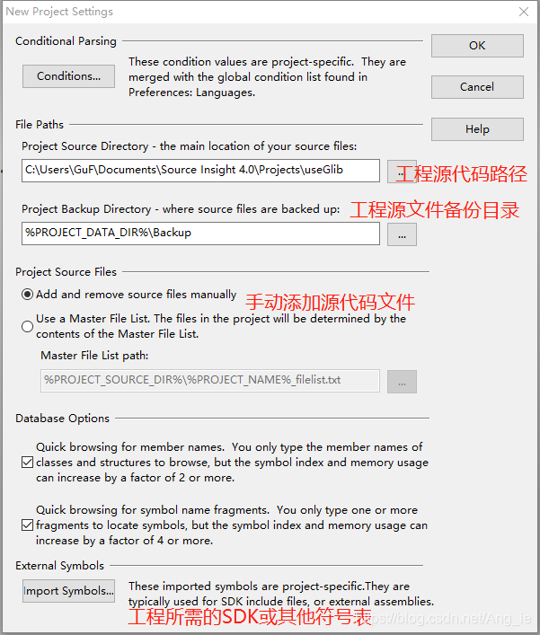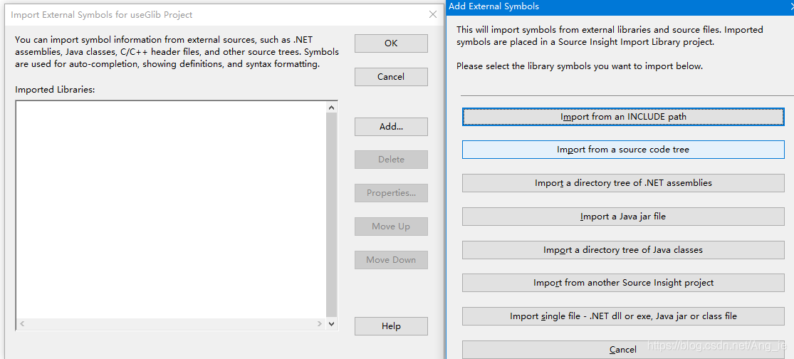 当同步完之后,发现还存在函数为黑色字符,无法点击跳转到定义处,那这是上述第二种情况,当前的项目工程中不包含该函数,该函数是系统函数或者是SDK中的函数,这时候如果期望去看到这样的函数,首先我们需要有这样的库函数的源代码文件,然后将其仅仅以额外符号表(不属于本项目工程)的方式导入,供浏览代码使用。点击菜单栏的Project > Import External Symbols for Current Project(存在另一个标签是Import External Symbol,是为所有的其他项目添加额外的符号表,选择哪个根据情况而定,这里仅仅考虑当前的项目工程),会出现如下对话框。再点击Add按钮后出现右边的对话框: