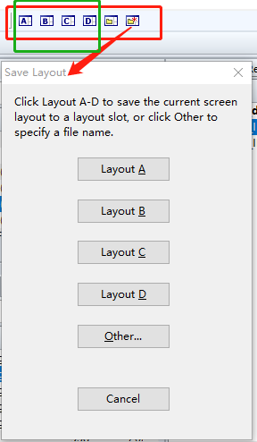当创建了一种新的布局,还可以将该窗口布局进行保存,窗口布局相关按钮在工具栏中,如下图红框中的按钮。点击最后一个图标Save Layout会出现对话框,可以将当前的布局保存起来,保存到ABCD中的任意一种布局按钮中,当下次想再切换使用该种布局,直接点击绿框中的按钮即可还原指定类型的布局。