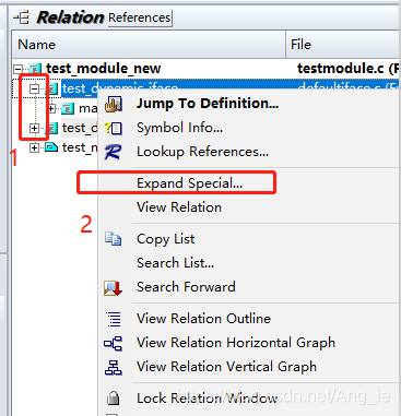 Relation窗口查看函数被调用处,若看调用处的函数被哪里调用,可以继续点击 + 号(如下图标识1),显示更多的调用关系,或者右键某一个函数,选择Expand Special按钮(如下图标识2处),会弹出对话框,给出调用层级数则会显示出指定层级的调用关系。