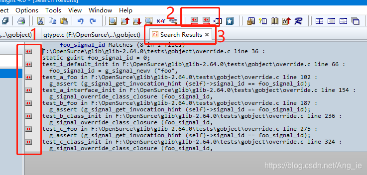 当查找结束后,会出现一个单独标签Search Result用来显示查找的结果,可以发现每一条结果的前面都有如上图标识1的小按钮,需要查看那条结果就点击相应的按钮即可跳到相应的地,进行阅览。跳转到指定的地方后,可以通过上图中的标识2按钮进行上一条和下一跳结果的翻阅,或者快捷键SHIFT + F8, SHIFT + F9。