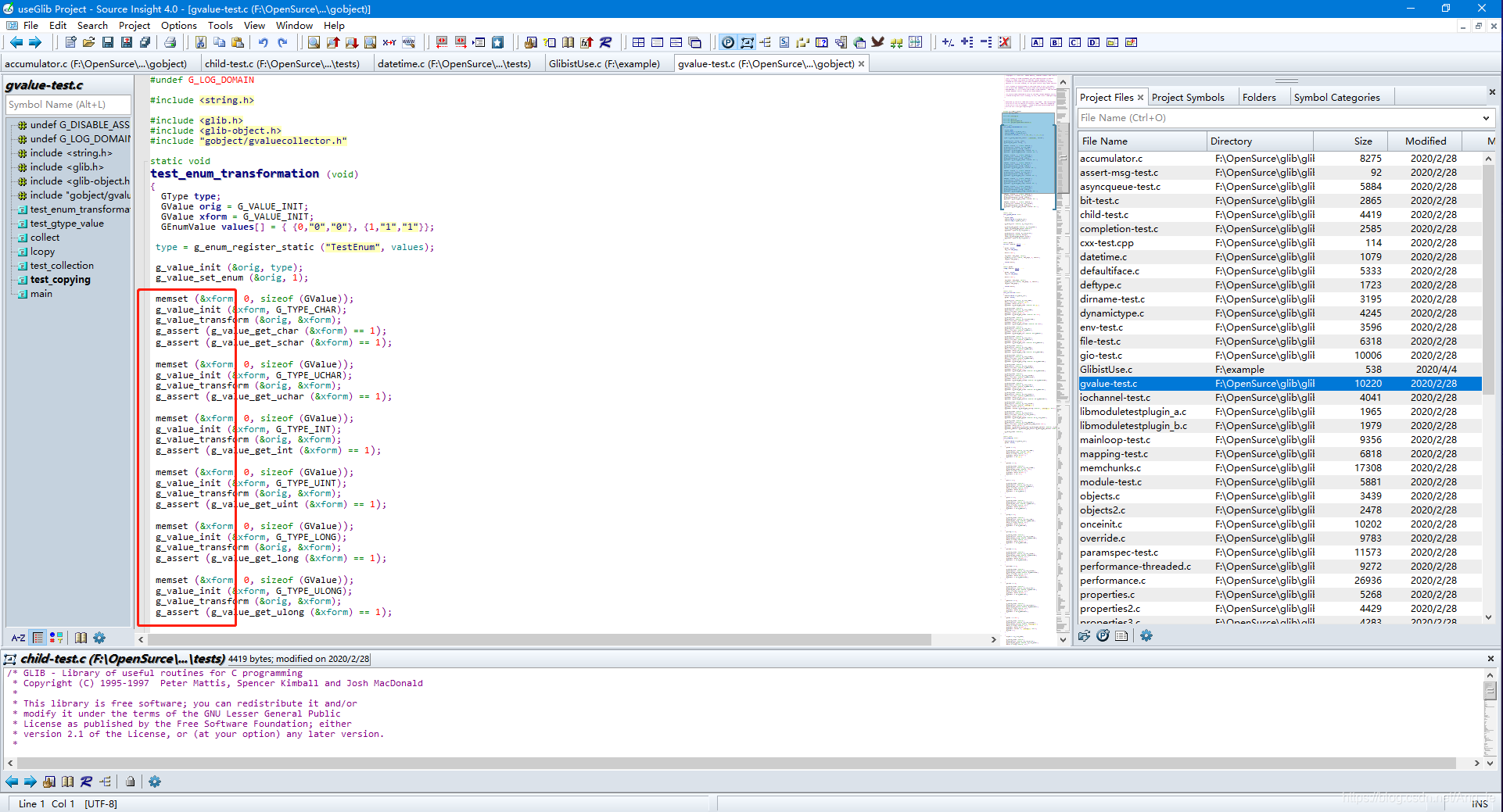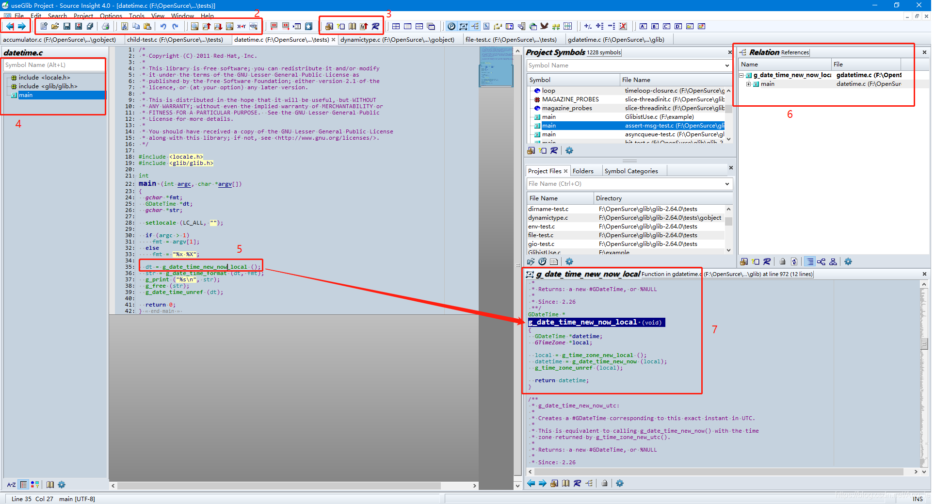 标识5处:当光标放在一个符号上时,标识6处窗口会自动显示哪些符号(函数)调用该出的符号,而标识7处的窗口会自动预览符号定义。详细情况见后面叙述。