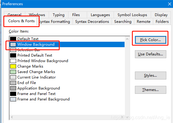 如上的方式是临时的,只能改变当前.c代码编辑窗口的颜色,并没有修改其他代码编辑窗口的颜色,如果需要改变整个工程代码编辑区的点击菜单栏Options > Preferences出现图下图对话框,然后点击Color & Fonts标签,选择Window Background在点击右边的Pick Color即可选择颜色,然后点击确定就可修改代码编辑区的颜色。