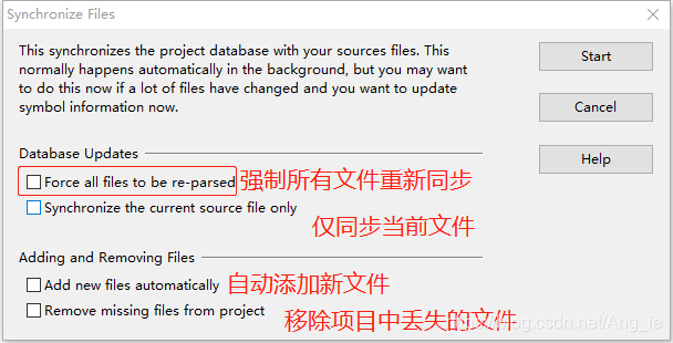 针对以上的第一种情况,一般是项目的文件过多,后台自动同步比较慢,需要在菜单栏中点击Project > Synchronize Files去立刻触发文件同步,创建项目文件中所有的符号表链接,会出现如下对话框,将红框中选项勾选,然后点击Start选项开始同步(项目较大时等待同步结束的时间较长)。