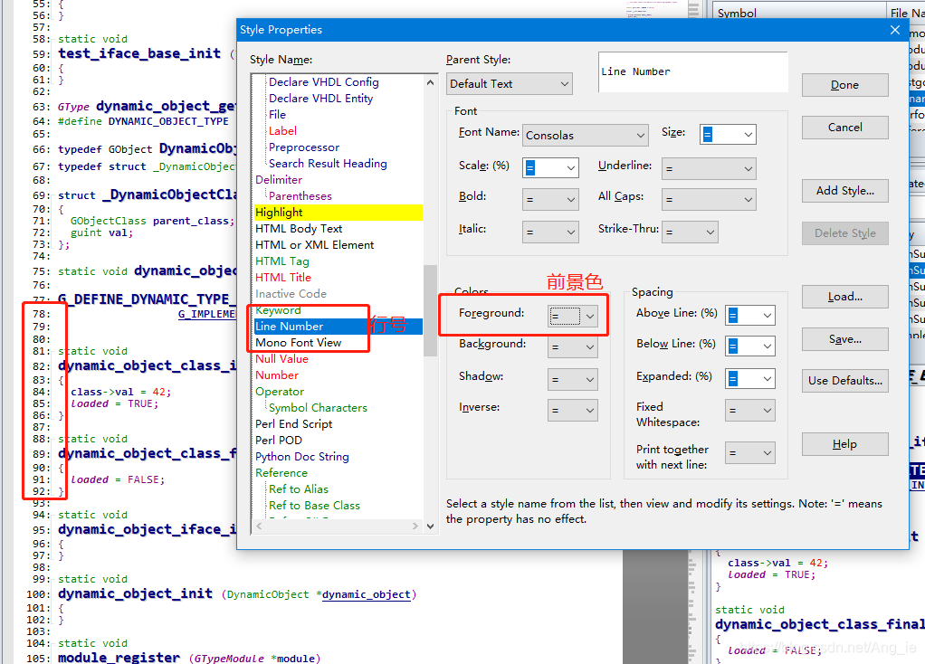 如果觉得上图中的代码行号过于浅显,尤其在后面更换背景颜色的时候,会发现行号更加的浅显,这里可以改变行号的颜色。选择菜单栏的Options > Style Properties,在出现的对话框左边的Style Name中找到Line Number,点击后然后在右边找到Color标签,选择Foreground修改前景色,会发现此时的行号已经变成黑色,清晰易见。