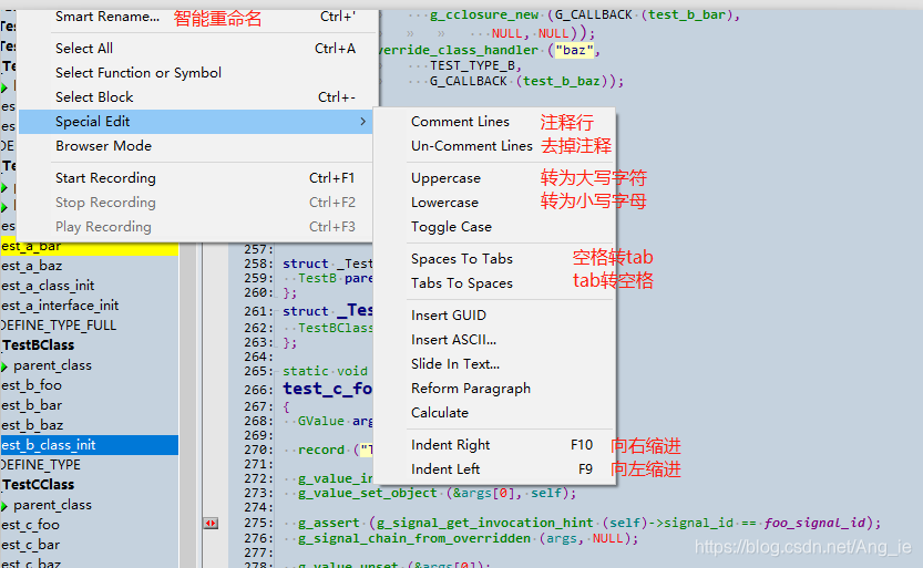 点击菜单栏edit > special Edit后能看到其他多种特殊编辑操作。选中一段代码后,然后点击这里面的选项及可以进行相应的编辑操作,如下图中的一些文字标注是常用的编辑功能。