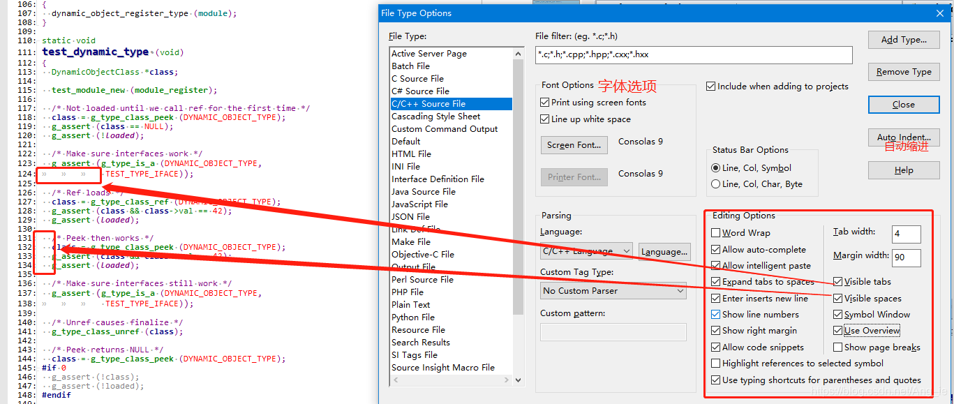 在很多的代码规范中,有要求代码缩进不能使用tab键,而要使用空格键,这时候要知道代码前留空的地方是空格还是tab可以通过点击菜单栏Options > File Type Options出现的对话框来设置,如图下图,勾选Visible tabs和Visible spaces分别是将tab键和空格键可视化。关于Editing Options编辑选项(红框中)下面再介绍几个: