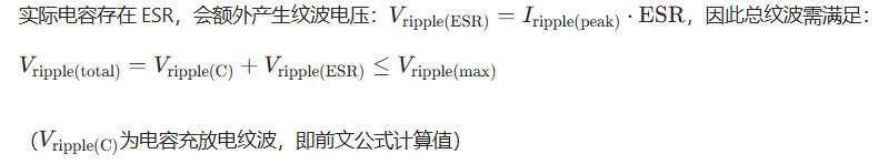 在CCM模式(电感电流不降至零),输出纹波电压主要由电容充放电产生,计算公式为: