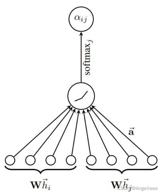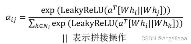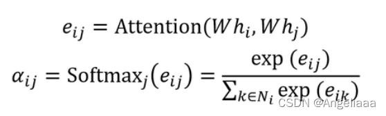 节点 j 是节点 i 的邻居,则可以使用 Attention 机制计算节点 j 对于节点 i 的重要性,即 Attention Score: