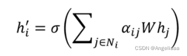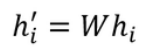 对节点特征向量 h 进行线性变换,可以得到新的特征向量 h'i,维度是 F',如下所示,W 为线性变换的矩阵
