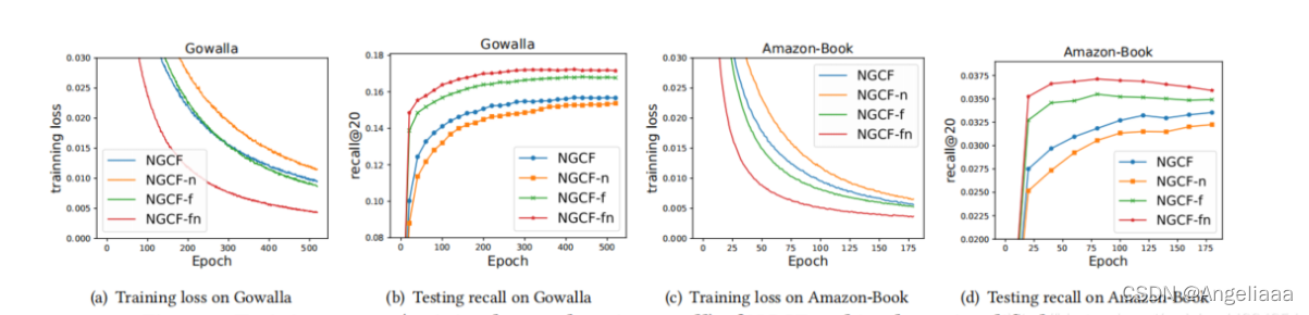 3.总体而言,特征变换和非线性激活对NGCF产生了相当负面的影响,因为同时去除它们,NGCF-fn比NGCF有很大的提高(召回率相对提高9.57%)