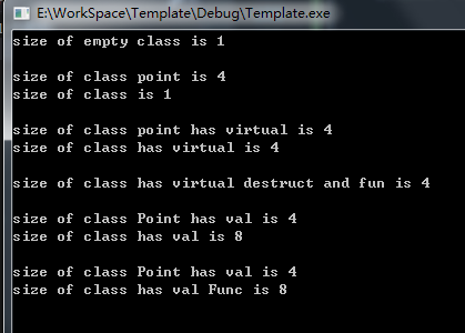 在这里列出了空类,类有函数,值,没有函数的大小,注意Class是默认字节对齐