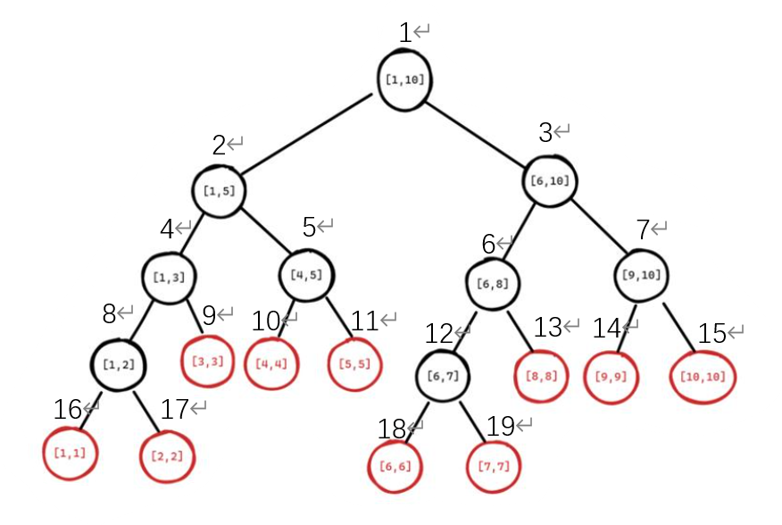 在用结构体数组存储时,根结点对应区间是[1,n],下标为1;每个叶节点的l和r都相等,对应原数组。每个能“劈”成两半的结点如果下标为i,那么它的两个孩子的下标就分别为i*2和i*2+1。