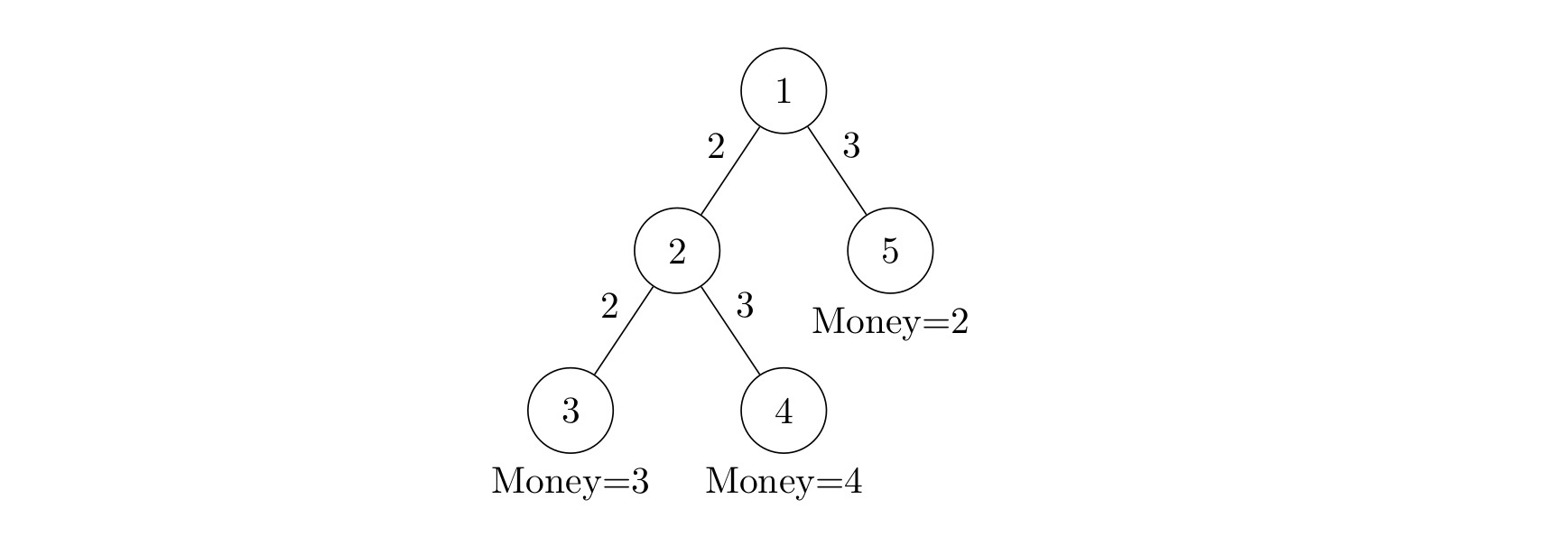 如图所示,共有五个结点。结点 ① 为根结点,即现场直播站,② 为一个中转站,③④⑤ 为用户端,共 M 个,编号从 N−M+1 到 N,他们为观看比赛分别准备的钱数为 3、4、2。
