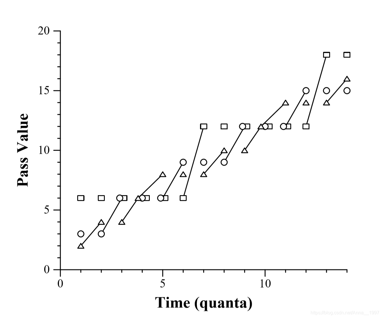上图时表示随着时间的推移各进程的pass值的变化,每一个时间单位相当于一个时间片结束,选择一个进程分配时间片,□、○、△分别代表三个进程。