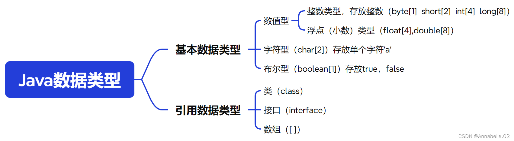 类型 占用存储空间 范围 byte[字节] 1字节 -128 ~ 127 short[短整型] 2字节 -2^15 ~ 2^15-1 int[整型] 4字节 -2^31 ~ 2^31-1 long[长整型] 8字节 -2^63 ~ 2^63-1 -