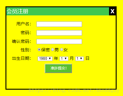 <div class="header">会员注册<span class="close">X</span></div>