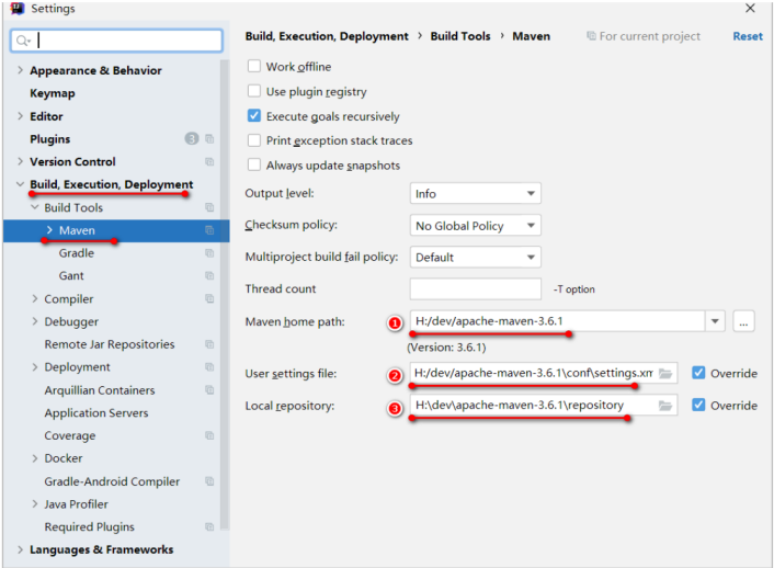 配置maven安装目录、setting.xml及本地仓库的位置。
