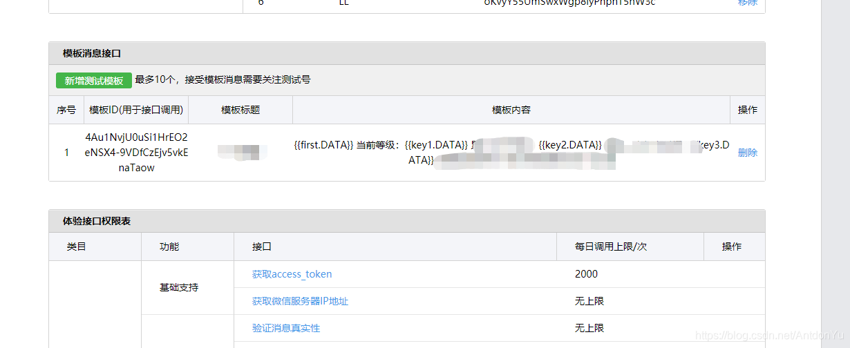 在开发微信的时候可能会用到测试接口,需要配置系统回复的模板消息,如图的模板消息接口,之前看到但是忽略了这个点,晕