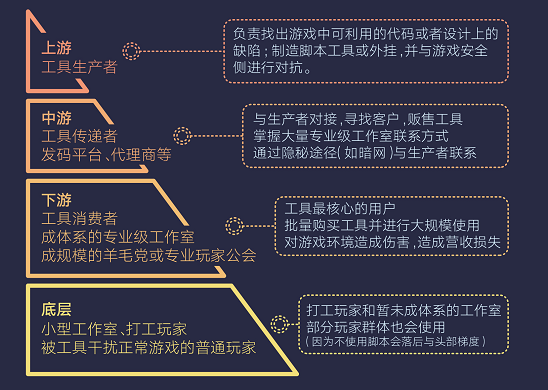 SLG工作室通常使用定制化挂机脚本/注册脚本,难以查封,售价也更加贵一些。可以说资源商的存在给外挂团队提供了很大的空间。