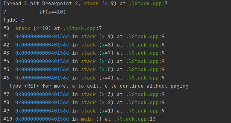 b stack打上一个断点,然后continue多次后使用bt查看堆栈信息 -